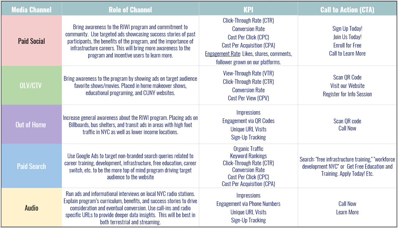 Use a variety of media channels that both Gen Z and older Millennials live in to increase awareness and brand visibility as well as encourage those still undecided in a career path to consider RIWI as an option.