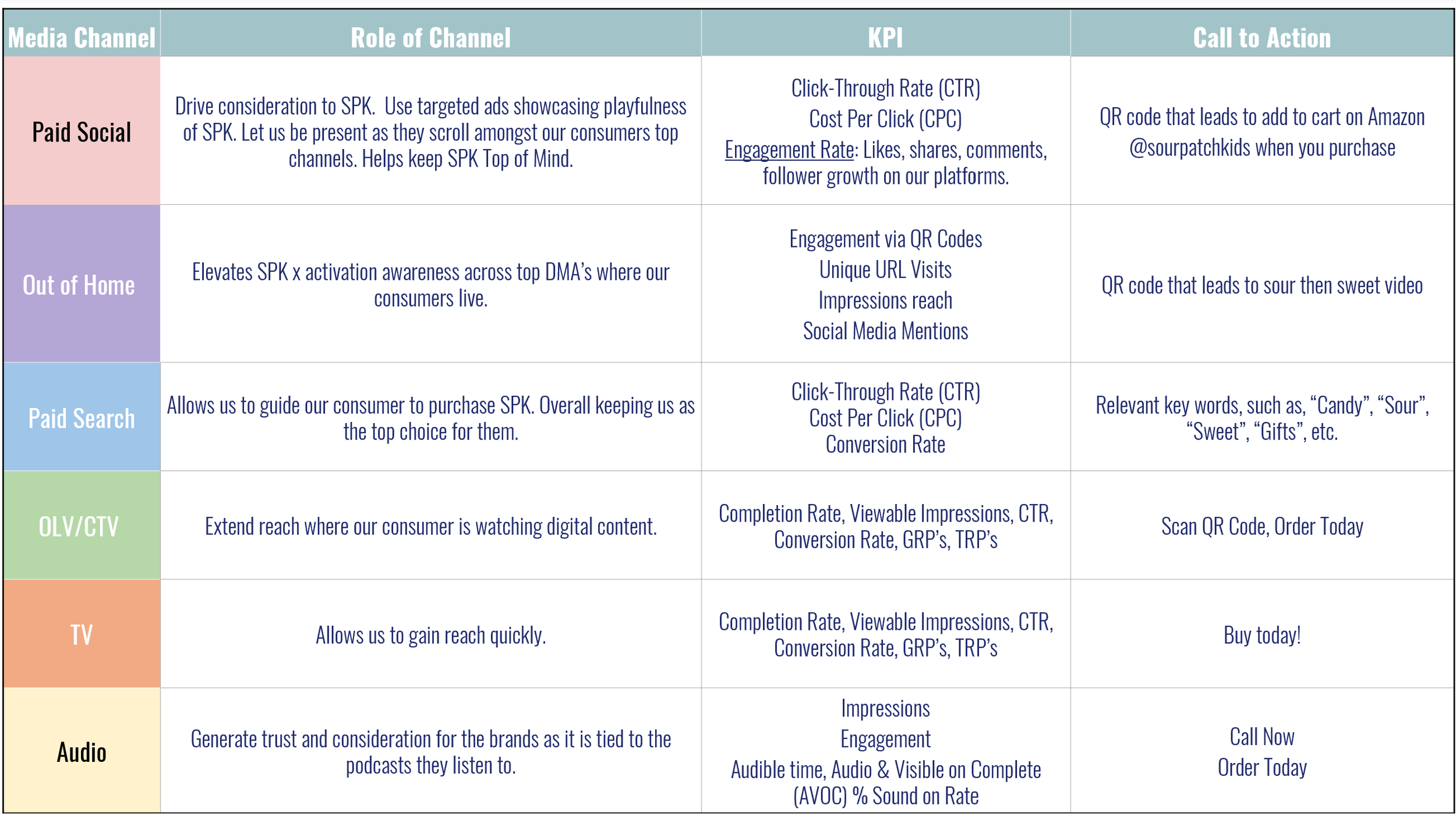 Use a variety of media channels that both Gen Z and older Millennials live in to increase consideration as well as incentivize those in the NCC space to purchase SPK.